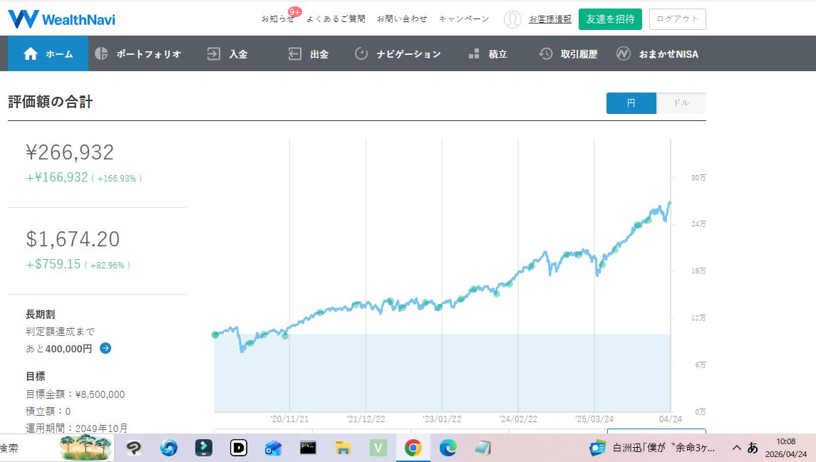 ウェルスナビ→初期投資金額10万→そこから一切追加入金なし放置