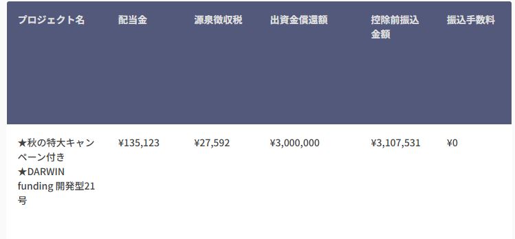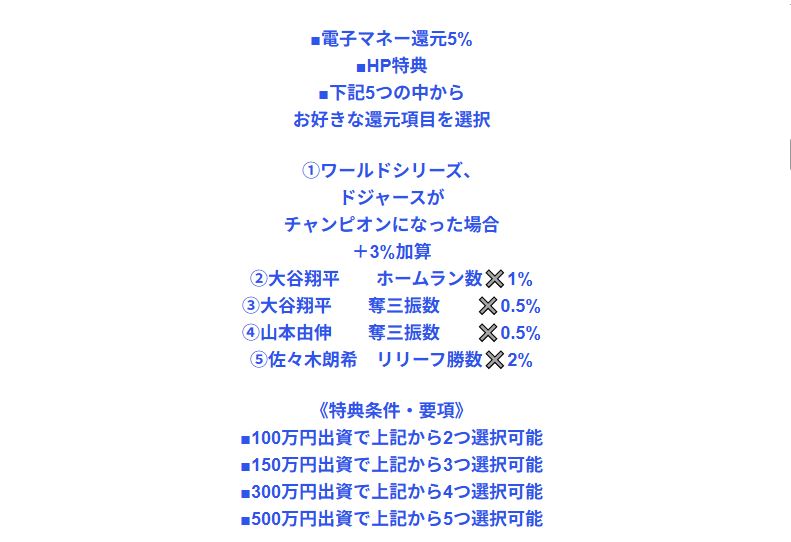現在、投資した金額の電子マネー5%+各種ファンドの特典(肉とか米とか炊飯器とか色々もらえる)