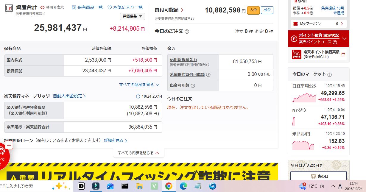 楽天証券の現金余力もまだまだ1000万以上と余力が有りますので