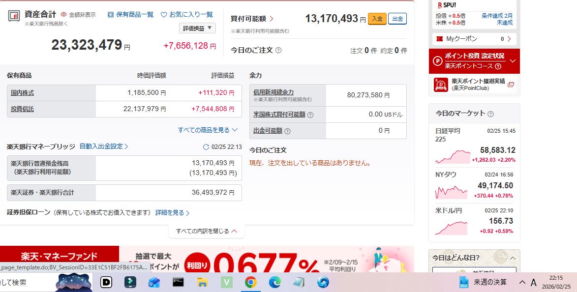 楽天証券の現金余力的には後200万~300万ぐらいは